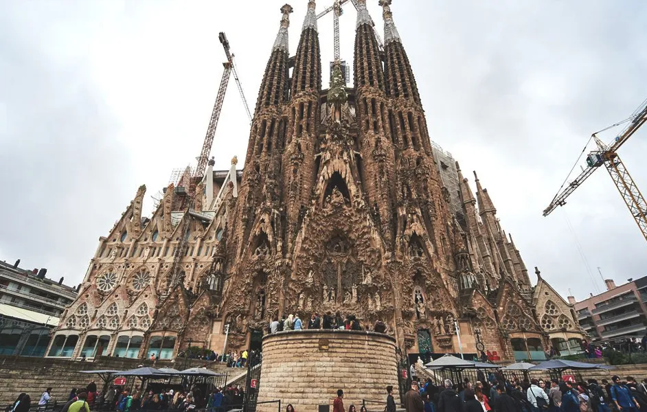As you move toward Sagrada Família, the basilica’s tall spires and intricate facades welcome you. Begun in 1882 and expected to be completed in 2026, it will feature a central tower of 172.5 meters, making it the tallest church in Europe.