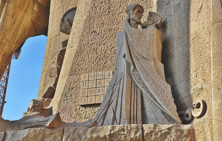 • The famous Subirachs touch appears in the magic square, a numerical grid that always adds up to thirty-three. It is a small detail that many people miss, yet it adds another layer of meaning to the Passion Facade Subirachs design.