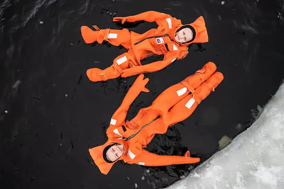 - Swim in icy waters wearing a survival suit during designated stops.