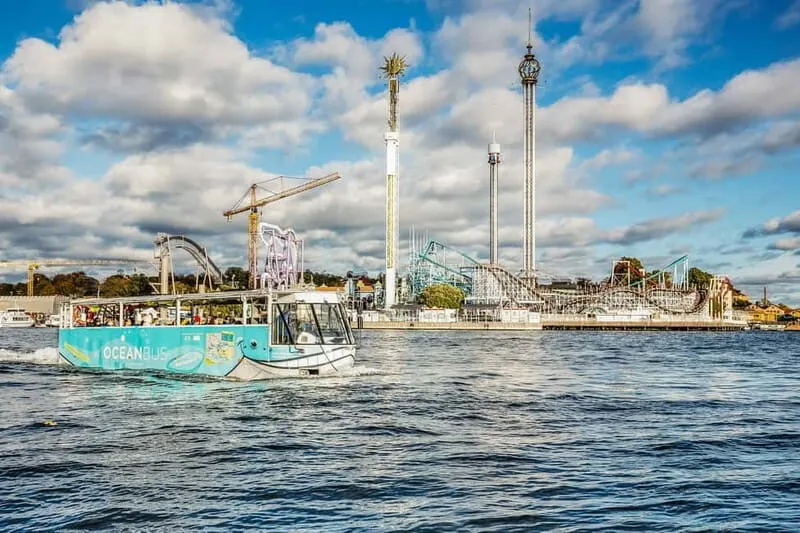 Suddenly, the road changes from tarmac to gravel—and then the real adventure starts: the bus splashes into the water. Hold on tight to your cameras and phones as the vehicle glides into the water, offering an exhilarating sense of floating. As you cruise, hear stories about Djurgården Island, pass the Vasa Museum, and see Sweden’s oldest amusement park, Gröna Lund.